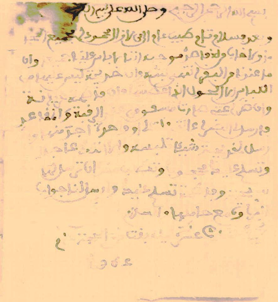 وبعد سلام تام طيب عام إلى من لا زال محمودا بجميع المحامد، ولا خاب من له قاصد. موجبه أننا لا بأس علينا جميعا، وأن ما عندنا من البقر انتهى لبنه، وأن خديجة ليس عليها من اللباس إلا الحولِي الذي أعطيتَه لها، وأن فاطمة عريانة، وأن ضراعتي صارت تتشقق من عند الرقبة والمقاعد فأرسل لي الضراعة التي قلت لي أو واحدة أجد منها، وأرسل لخديجة شيئا تلبسه، وإلا تأتيك عاجلا. وتسلم عليك محجوبه وتطلب منك أن ترسل لها ملحفة، وفاطمة تسلم عليك وأرسل لنا جواب البراوة مع حاملها والسلام. ثلاث عشرة ليلة بقيت من ذي الحجة عام 1362. (15 ديسمبر 1943).