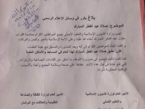 اعنت وزارة الشؤون الاسلامية في بيان وزعته مساء اليوم تعليق صلاة العيد