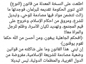 اطلعت على النسخة المعدلة من قانون (النوع) الذي تنوى الحكومة تقديمه للبرلمان، فوجدتها ما زالت تتضمن مواد فيها مصادمة للوحي، وتبديل للشرع، ومروق من احكام الإسلام، وخروج على قيم المجتمع، وتهديد لكيان الأسرة، وظلم للرجل والمراة معا!!