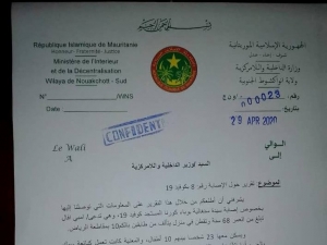 حصلت صحيفة نواكشوط على تقرير رسمي بعثه والي ولاية نواكشوط الجنوبية اليوم إلي وزير الداخلية يؤكد ان المريضة تسكن في منزل من طابقين في حي 10 بالرياض وانه ويسكن معها 23 شخصا بينهم10 أطفال