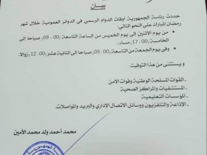 اصدرت وزارة التوجيه الاسلامي مساء اليوم الخميس بييانا بشأن صلاة التراويح وقد رخص البيان الذي حصلت نواكشوط على نسخة منه للامام والمؤذن في كل مسجد فقط لتمكين من اداء صلاة التراويح وتفادى تعطيل قيام هذ الشهر المبارك