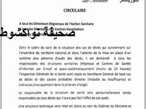 اصدرت وزارة الصحة الموريتانية تعميما الي كافة المستشفيات والعيادات والمراكز الصحية في موريتانيا بالابلاغ عن اية حالة وفاة تسجل بها وذلك في اجل لا تجاوز 24 ساعة