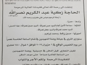 توفيت صباح اليوم الخميس زكية عبد الكريم نصر الله، شقيقة أمين عام "حزب الله" اللبناني حسن نصر الله