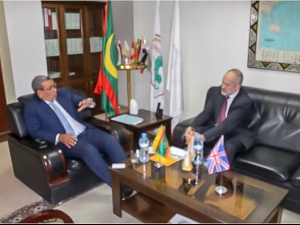أجرى السيد احمد باب ولد اعلي رئيس غرفة التجارة والزراعة الموريتانية اليوم الخميس بمكتبه بالقصر القنصلي في نواكشوط مباحثات مع السفير البرطاني المعتمد لدى موريتانيا سعادة السيد سمون بايدون شملت سبل تعزيز التبادلات التجارية والشراكة بين البلدين