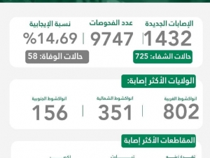 حسب انفوكرافيا صادرة عن وزارة الصحة الموريتانية اليوم الثلاثاء فقد بلغ عدد الإصابات المؤكدة خلال الأسبوع من 15الي 21 مامجموعه 1432 إصابة مؤكدة وقد تم إجراء 9747 فحصا وذلك بنسبة ايجابية بلغت14