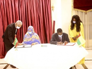 ترأس رئيس الجمهورية السيد محمد ولد الشيخ الغزواني ، الليلة في بيساو، رفقة مضيفه البيساو غيني السيد عمارو سيساكو امبالو ، حفلا تم خلاله التوقيع على اتفاقية بين بلادنا وغينيا بيساو في مجال التعاون التجاري والصناعي ،ووقعت الاتفاقية عن الجانب الموريتاني السيدة الناها منت حمدي ولد مكناس وزيرة التجارة والسياحة وعن الجانب البيساوي وزير التجارة الغيني السيد ارتورو سانيا